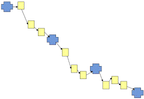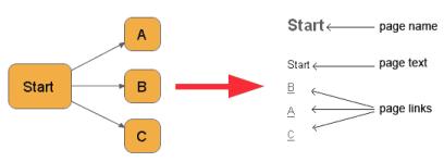 VUE and Labyrinth are complementary tools, with files created in VUE easily imported into Labyrinth. Each box in VUE becomes a page in the case and each arrow becomes a link. The text in each box becomes both the page title and also the text of the associated link. For example, the following VUE would lead to the following output: